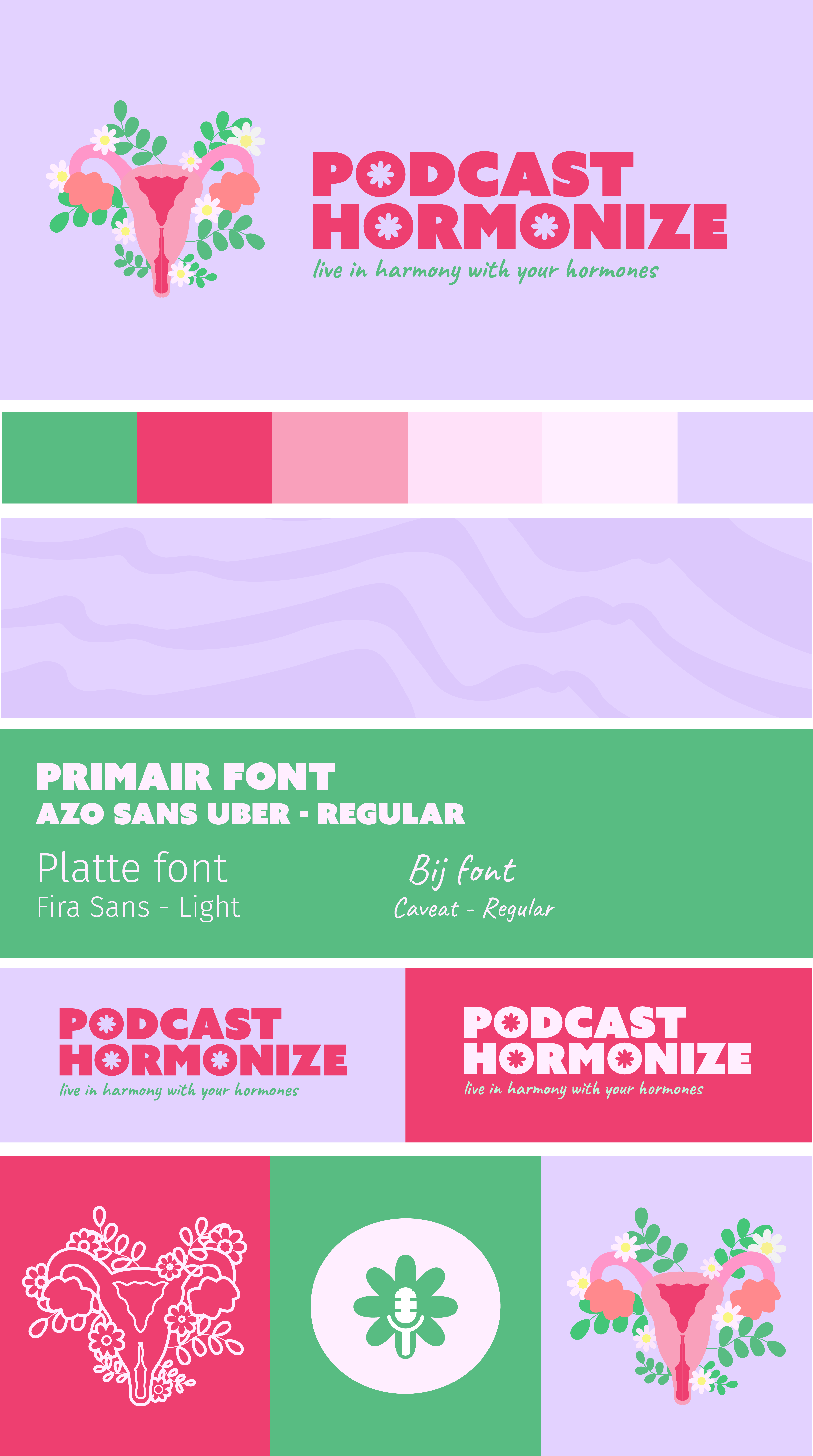 Voor Hormonize, een podcast over vrouwelijke hormonen en de natuurlijke menstruatiecyclus, heb ik een huisstijl ontwikkeld. De branding is gebaseerd op vrouwelijkheid, natuurlijk en balans, wat terugkomt in de kleuren, typografie en grafische elementen.